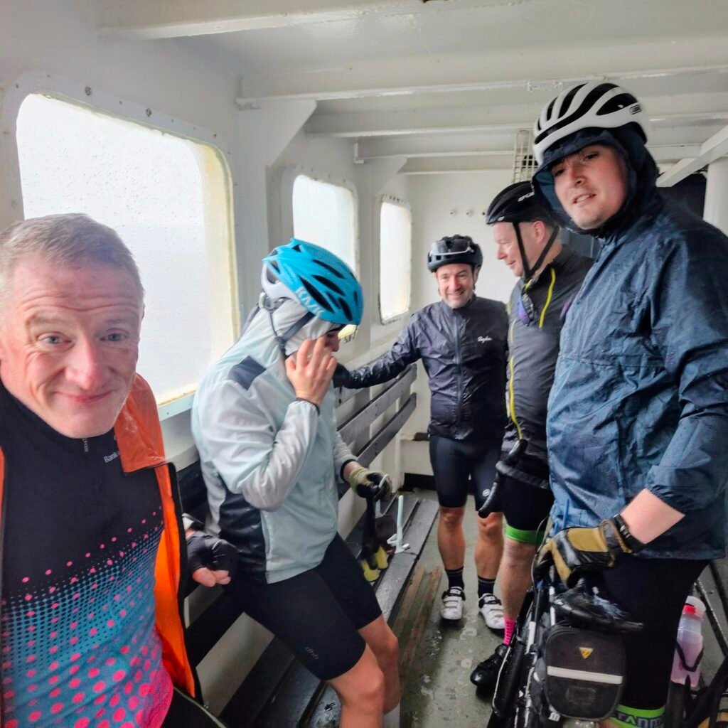 The ferry’s lower deck was filled with a roar or relief from the sodden cyclists.